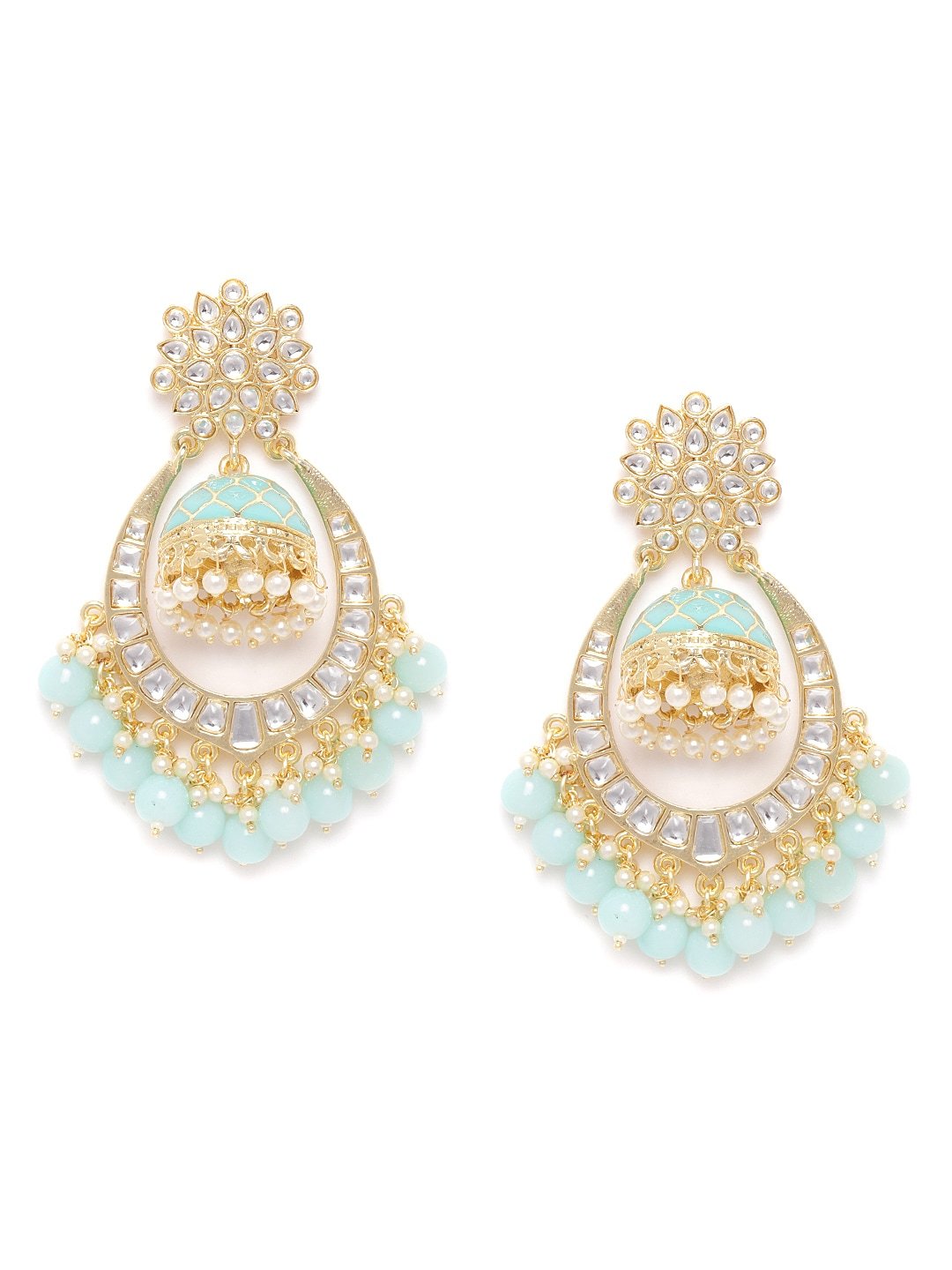 These beautiful turquoise dome shaped jhumka earrings come with kundan stone studs & beads, are gold-plated and are secured with a post and back closure.